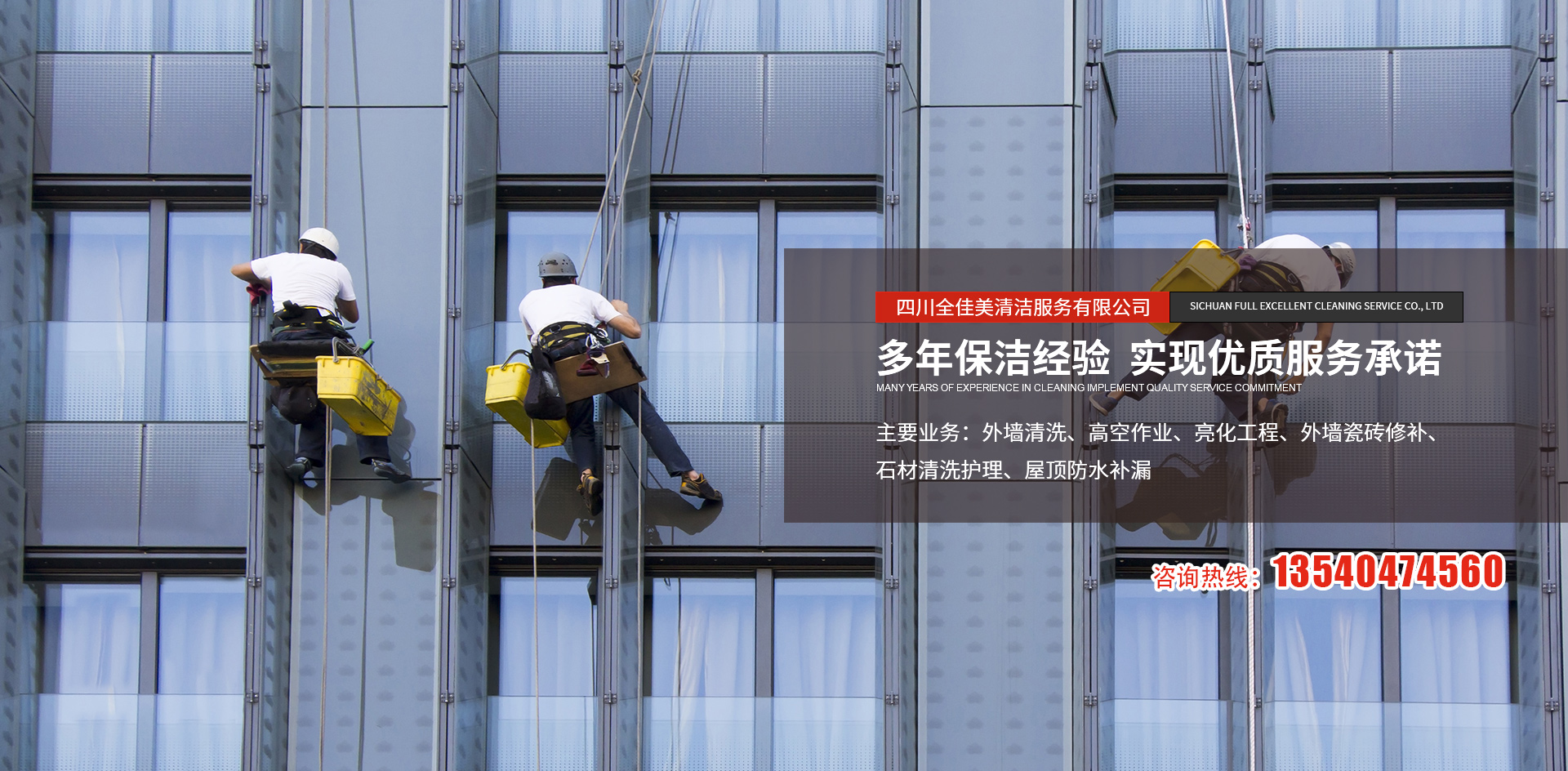 四川全佳美清潔服務(wù)有限公司成立于2017年11月20日,注冊資本200萬元人民幣,是一家專業(yè)從事高空外墻清洗,外墻維修,開荒保潔,石材養(yǎng)護,外墻防水等一體化的工程服務(wù)公司。公司先后服務(wù)于成都鐵路培訓(xùn)學(xué)校,雙流空港酒店,省體育館等寫字樓及工業(yè)園區(qū)的外墻清洗保潔及維修服務(wù)。經(jīng)過多年的發(fā)展與努力,公司已具備一定的規(guī)模及實力?,F(xiàn)擁有一支技術(shù)精湛的服務(wù)團隊,以高標(biāo)準(zhǔn)的服務(wù)品質(zhì),專業(yè)的安全技術(shù)實力,為全川不同群體的客戶提供更安全,更周到的清洗服務(wù)解決方案,期待與你的合作。